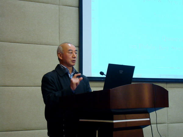 颜松远教授从图灵机的基本原理讲起,他介绍了计算的本质和计算数论的发展历史及相关背景,整数分解的准确定义,整数分解问题难解性的根本原因,现代整数分解的一些代表算法,以及整数分解在密码学中的应用。颜教授阐述了基于Shor量子算法解决整数分解问题的新思路,指出量子计算作为一种理论计算模型其优越性在于能将计算问题的时间复杂度控制在BQP级别,即理论上存在一个使用量子计算机的算法以很高概率在多项式时间内计算出正确结果。同时,颜教授也剖析了目前量子计算的前沿性成果和发展瓶颈,指出难点在于量子计算机的构造和实现上。他强调指出,汇聚数学、物理学、控制科学及电子信息学等学科的学者共同研究量子计算是实现该领域重大突破的必由之路。