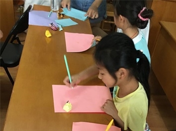 孩子们正在精心为剪纸创作