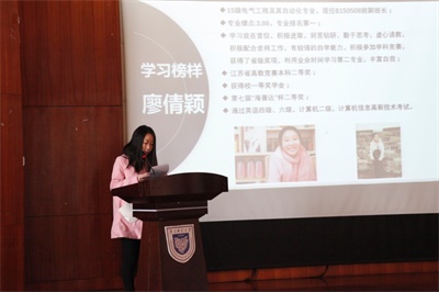 14级学生郝海晨作为工作榜样,就如何在学习、社团、班委工作中找到平衡同大家分享了自己的经验:来自15级的学习榜样廖倩颖则强调了大学时代学习的重要性,并分享了自己的学习方法和心得。