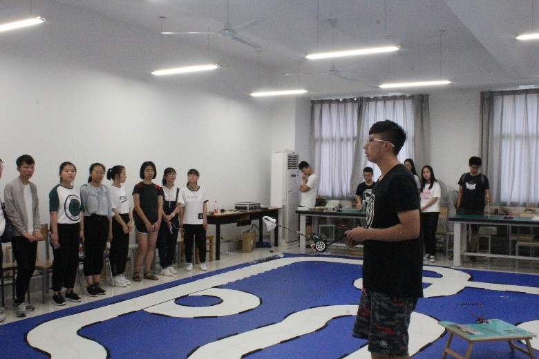 随后,范亭中学的师生们来到了手机百家乐 学科楼,分别对科协社团和阿波罗社团的实践基地进行参观。两个社团的成员向范亭中学的师生们分别展示了智能小车和智能机器人并对其运行原理进行了简明扼要的讲解。在观看电磁小车沿赛道运行时,高中生们流露出了非常浓厚的科创兴趣,他们对小车和机器人的制作与运行提出了相关问题,对此,手机百家乐 的同学们依据自己所学的知识一一进行了详细的解答。