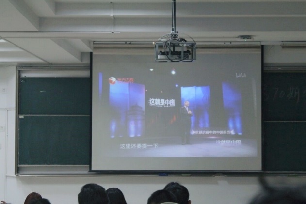 接着,菁英班成员观看《这就是中国-百年未有之大变局》及《这就是中国-全球抗疫中的中国担当》专题视频,视频彰显出了处在战“疫”一线的中国,在全球疫情防控中的大国担当。在抗击疫情中,中国政府的积极作为,中国人民的凝心聚力,是为阻止疫情大规模蔓延作出的巨大牺牲,也是对国际社会作出的巨大贡献。