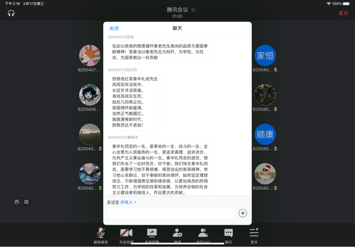 手机百家乐 2020级各团支部也于3月17日开展秦老事迹线上讨论会,旨在缅怀秦老,勉励南邮青年继往开来。讨论会介绍了与秦老相关的南邮发展历程以及秦华礼老先生的红色事迹,让同学们深入了解了秦老为南邮做出的巨大贡献,并深刻领会了秦老的精神。在“我想对秦老说”环节中,大家积极讨论,踊跃发言,道出自己的心声,以文字的形式表达内心深处对秦老的钦慕和怀念,表明自己要不断拼搏进取、开创未来的坚定信念。
