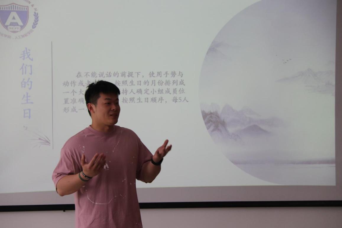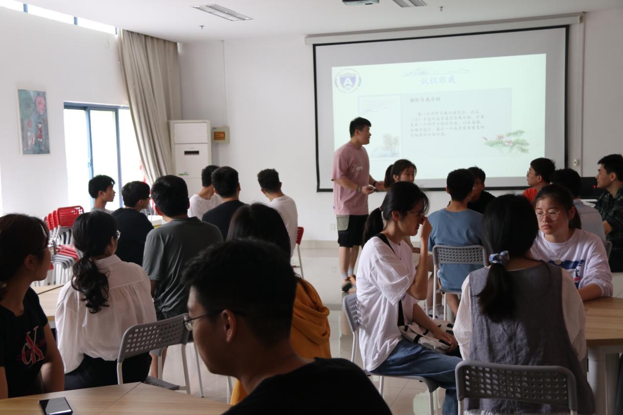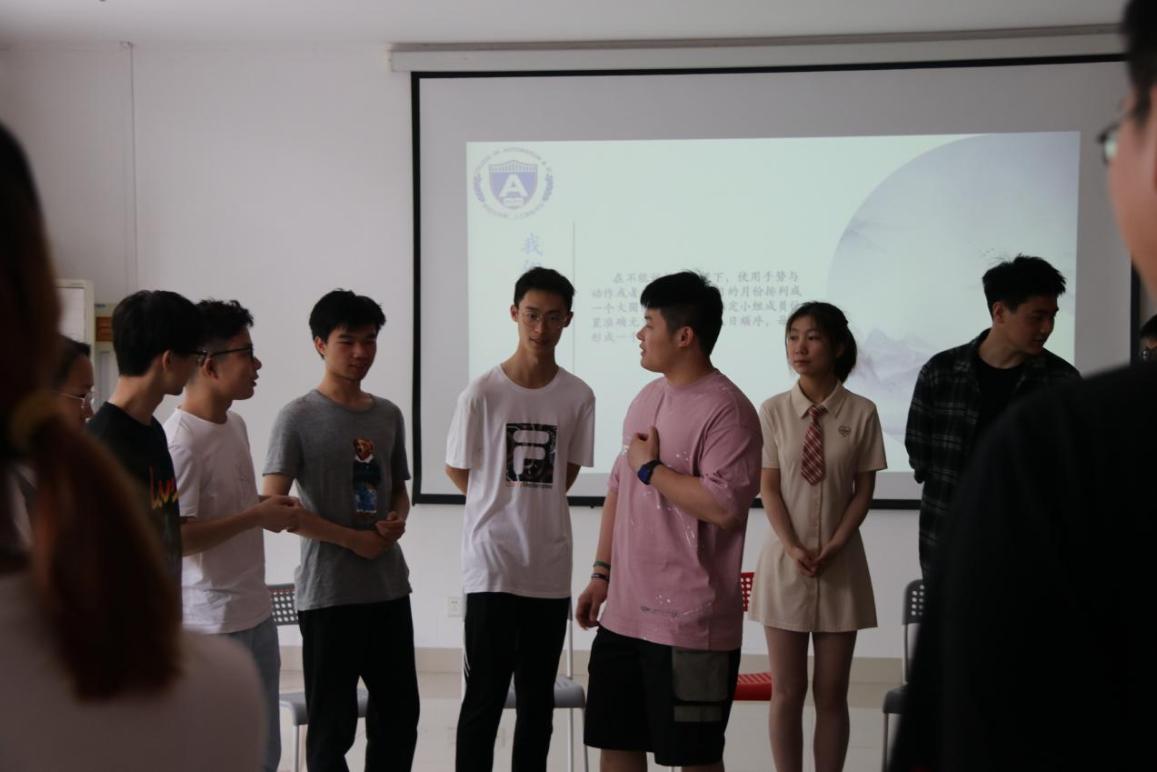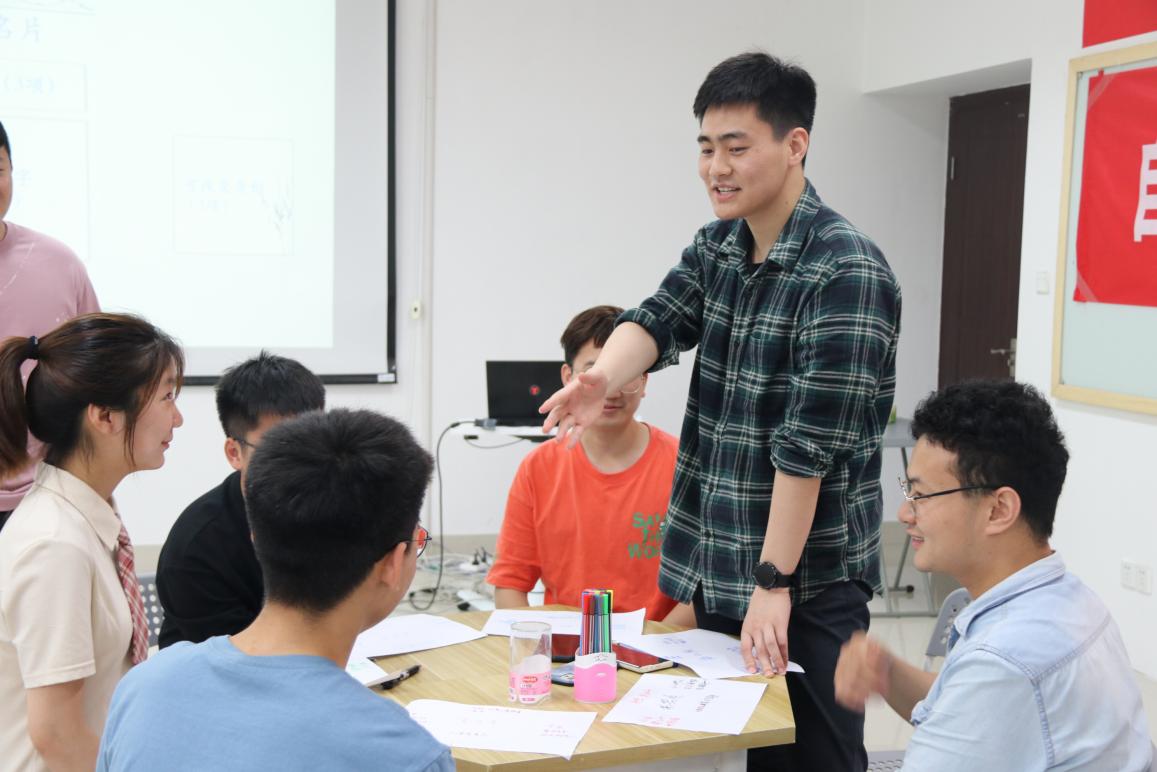 为帮助组内成员更好地认识和接纳对方,邵老师组织大家进行循环自我介绍。先是通过5分钟的组内交流,让彼此相互熟悉,有更深的了解。接着,每个小组的成员按照顺序依次介绍自己的姓名、家乡和爱好,后面的同学需重复前一个同学的介绍内容,以此类推,小组最后一名同学需重复之前所有成员的介绍内容。这也是对大家记忆力的考验,每当小组最后发言的同学正确复述所有成员信息,教室内就爆发一次热烈的掌声。