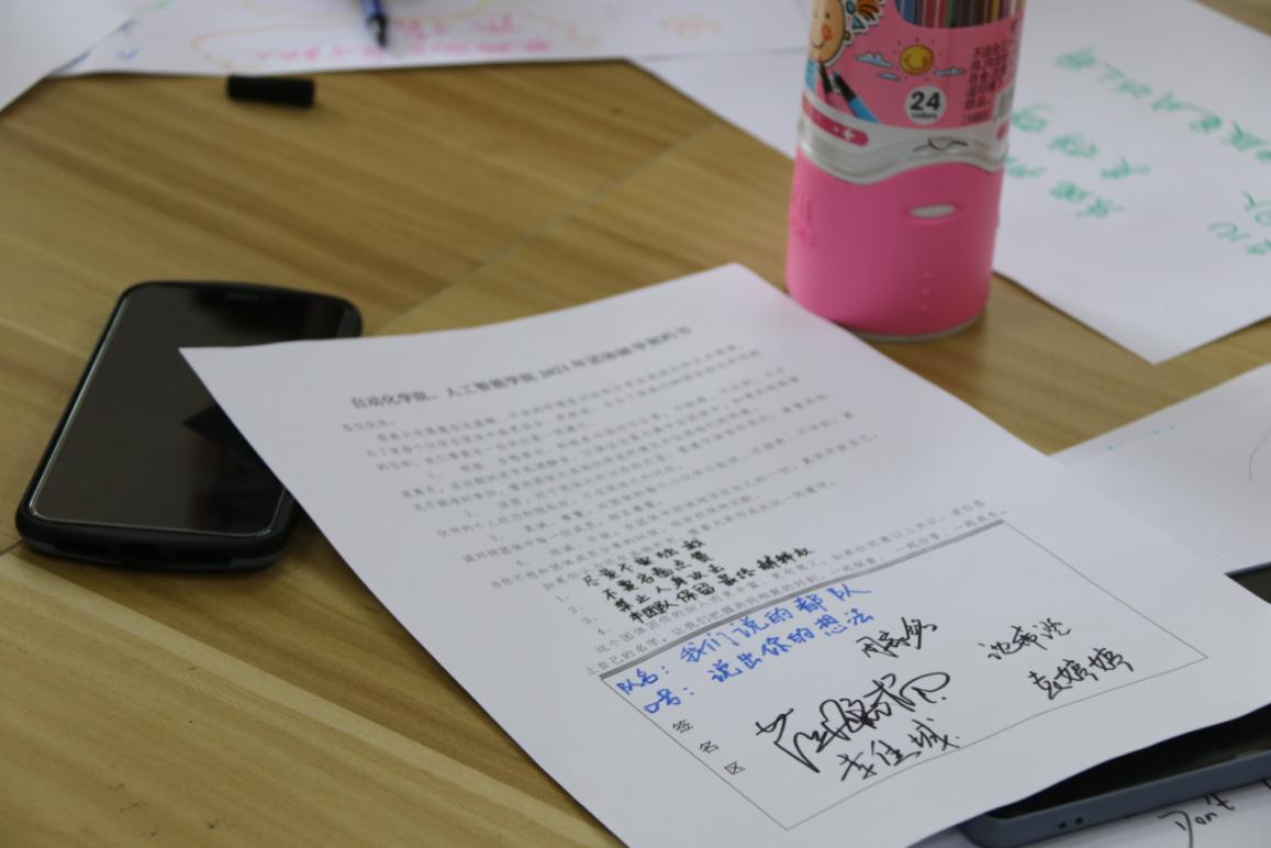 接下来,也是本期培训活动的重要部分——制定团队契约书。每个小组在组长的带领下,认真学习了团队契约书的内容,并对契约内容进行一定的补充,最后在契约书上郑重地写上每个人的名字。