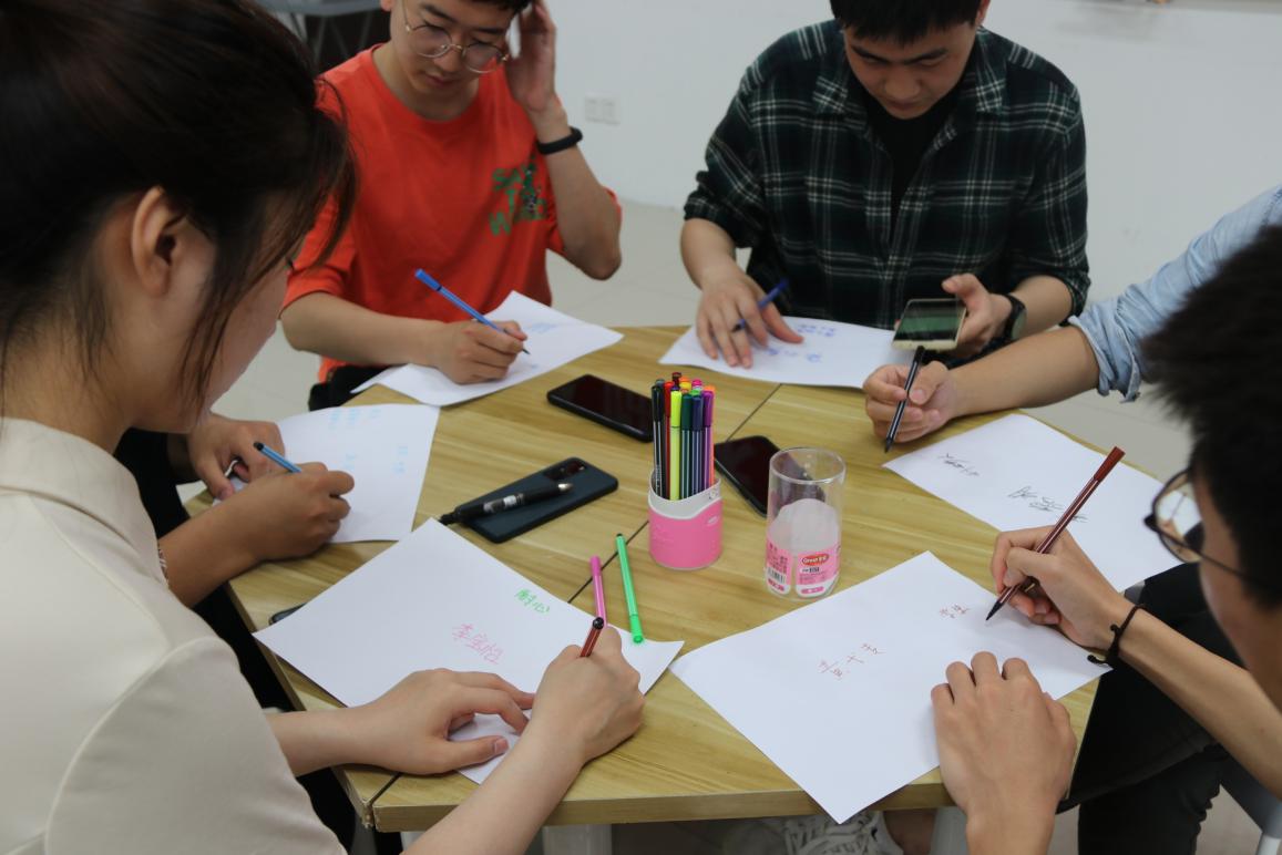在小组成员相互熟悉之后,邵老师带领大家进入本期团体辅导的第三个环节——“我的名片”。每个组员可以利用白纸和画笔为自己设计一张名片,要求在白纸对应位置写上自己或是昵称、可变与不可变的重要身份、性格特点以及座右铭等。大家认真思考,不断剖析自己,谨慎地在纸上写下对自己的思考。
