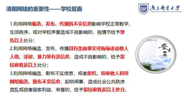 学校高度重视校园网络文化建设,注重培养师生网络文明素养。为进一步发挥好网络平台的教育功能,用科学理论、先进文化、主流价值引导网络空间发展,9月9日上午自动化学院、人工智能学院全体新生参加了“文明上网,共筑清朗网络空间”主题教育,活动由新生辅导员谢子行主持。谢老师首先从学校和国家层面向大家强调了遵守网络文明公约的重要性,接着通过“洁洁良”等实际案例为同学们分析了网络不文明行为及其严重后果,呼吁同学们依法上网、理性上网、文明上网。