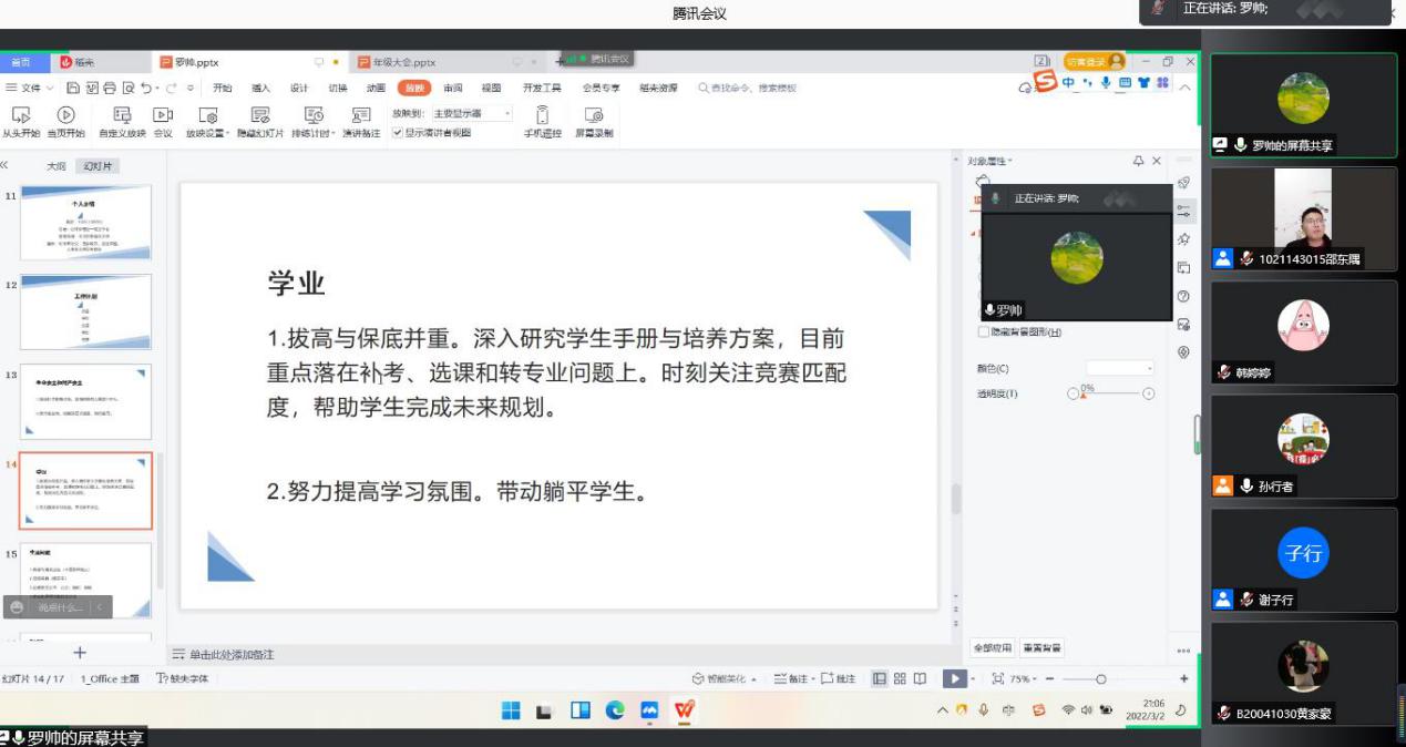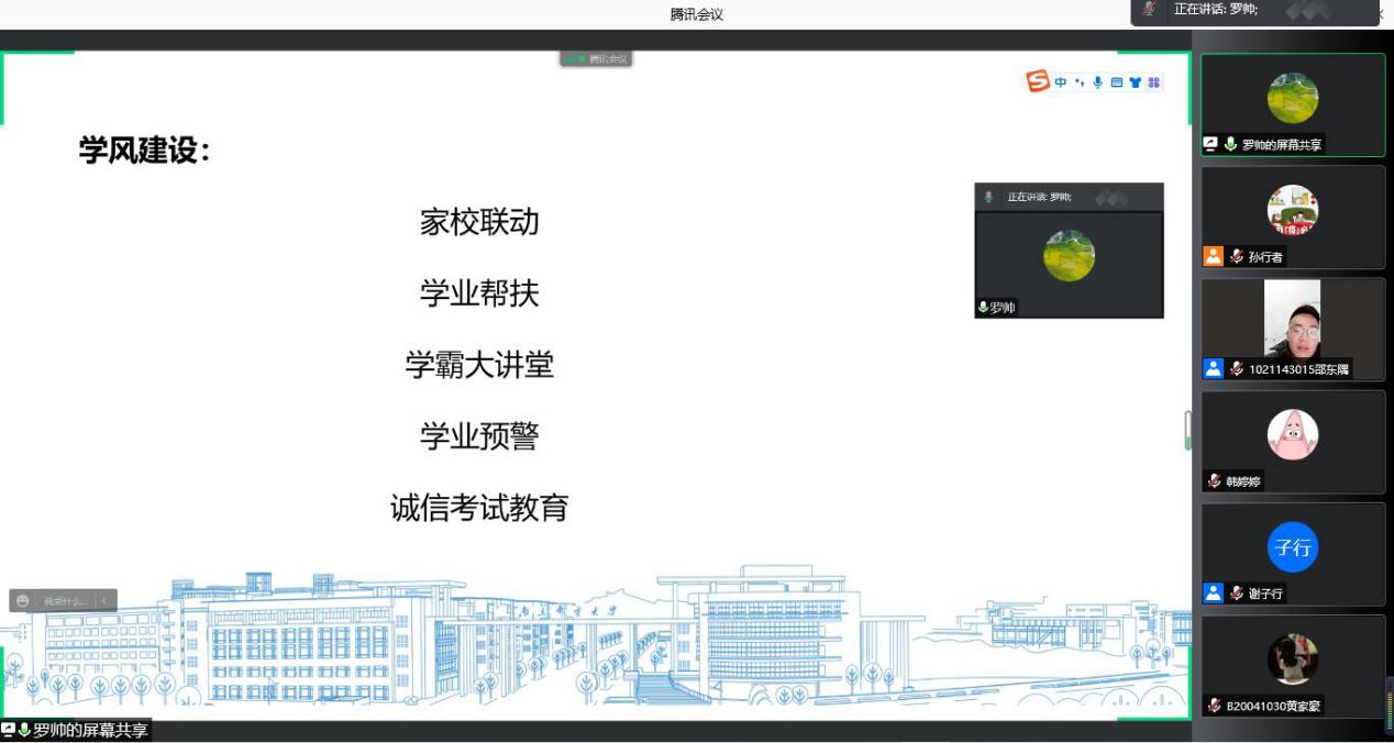 学院辅导员罗帅进行自我介绍,并从思想、安全、学业、生活和就业等多角度讲述未来工作规划。其中,着重提出对近期的疫情防控和防诈骗宣传工作要做实做细,让学生在内心上高度重视,行动上积极配合。