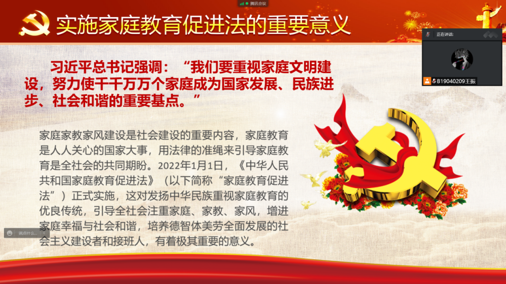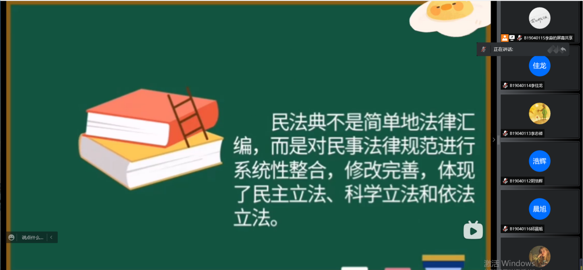 5月14日,学院以各团支部为单位,由团支书组织同学观看民法典宣传视频、学习家庭教育促进法;并以习近平法治思想为引领,进行青年法治宣传教育。与此同时,支部成员积极参与小组讨论,分享心得体会,进一步深化了自身对法治教育的理解,形成正确的法治观念,更加坚定地以习近平法治思想为指导,并决心能够在日后的学习生活中认真践行法治理念。同学们深刻的意识到,青年是祖国的未来、民族的希望,是社会主义现代化事业的建设者和接班人。在推进依法治国,建设社会主义法治国家的进程中,学法是重要的必修课,护法是重要的基本职责。