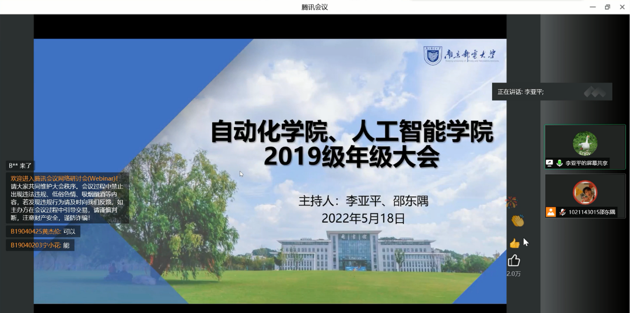 为做好常态化新冠肺炎疫情防控工作,提升学生法律安全意识,进一步帮助学生明确毕业规划,助力学生成长成才,5月18日下午,手机百家乐 通过线上线下相结合的模式开展了2019级学生年级大会。手机百家乐 2019级学生骨干线下参会,其余学生线上参会。本次会议由2019级辅导员李亚平和邵东隅老师主持,包含了疫情防控法律知识宣传、防火防灾警示教育以及毕业意向调研等内容。