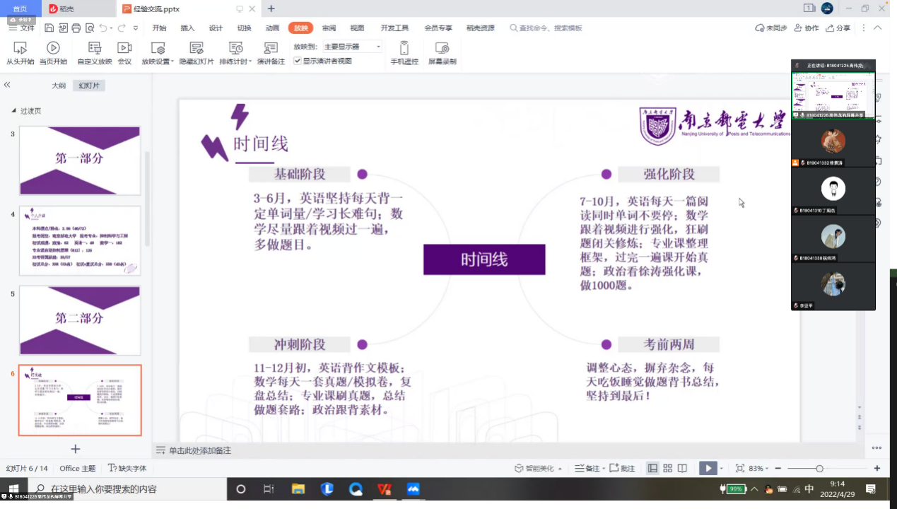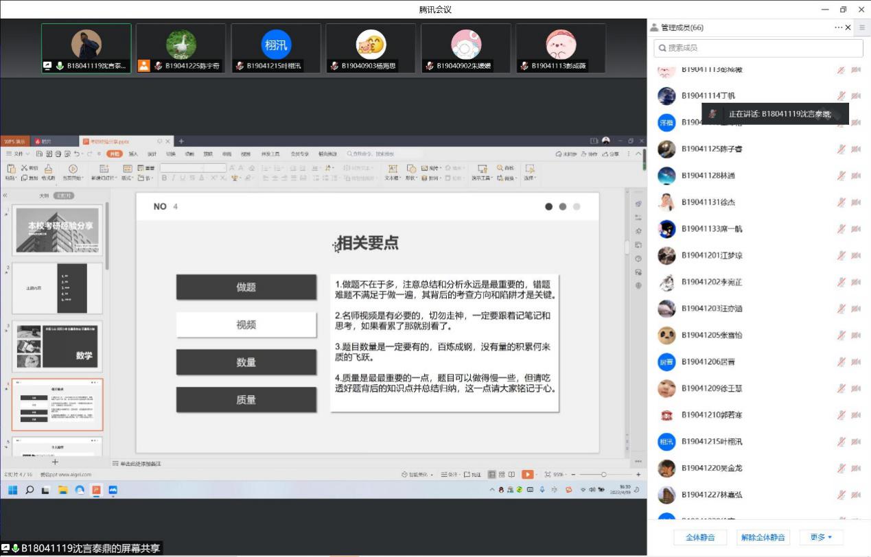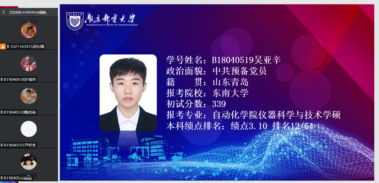 考研经验交流会是手机百家乐 的传统活动,旨在通过同辈对话与指导,提升学生的备考能力,增强学生考研信心。为进一步开展精细化的考研指导,营造浓厚的学习氛围,手机百家乐 2019级5个专业于近日分别陆续开展了考研经验交流会,特别邀请到2018级已成功考取硕士研究生的吴亚辛、廉洁、高伟龙等12位学长学姐进行了经验分享。2019级辅导员老师全程参加。2019级同学们积极参与,收获颇丰。