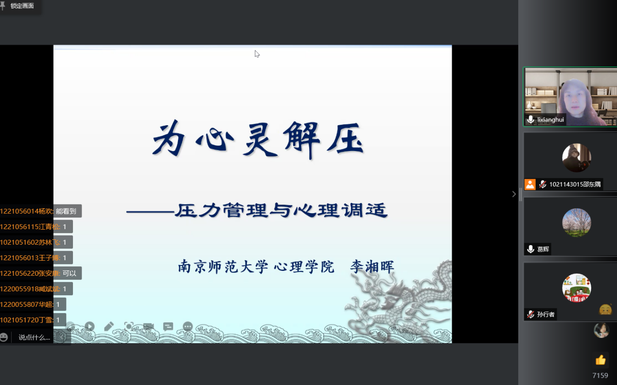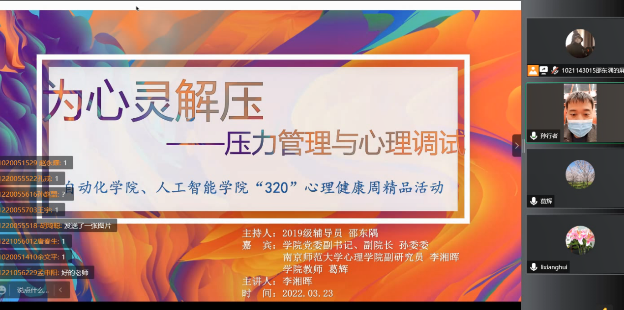 为普及心理健康知识,帮助大学生舒缓大学生活的压力,手机百家乐 于3月23日晚开展“为心灵解压”主题线上讲座。本次活动邀请了南京师范大学心理学院副研究员李湘晖担任主讲,学院党委副书记兼副院长孙委委、电气系主任葛辉出席,活动由学院心理辅导员邵东隅主持,学院本科生、研究生共524人参与活动。